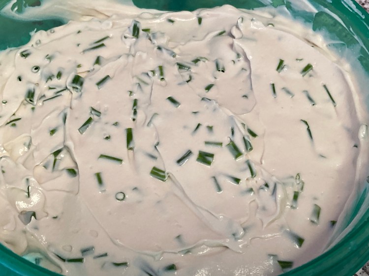But, I tried this ridiculously simple recipe for vegan Quark instead. How simple is it? All you do, is buy plant-based yoghurt and let is strain through a cheesecloth and sieve for 8-12 hours. At this point, I added fresh chives, in part, just so I felt like I was actually “cooking”.