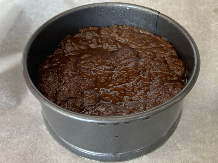 I poured the thick mixture, which easily slid out of the pan in one big lop, into a springform and tried to form it best I could with a spoon. I purchased a wired-cheese slicer just for the occasion.