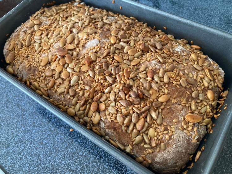 I made the Norwegian Fjellbrød to enjoy with the Gjetost. This bread calls for sesame seeds, pumpkin seeds and flaxseeds as well as over a cup of milk. I used soy milk, but I’ll bet oat milk would be very good in this recipe because one of the ingredients is rolled oats.