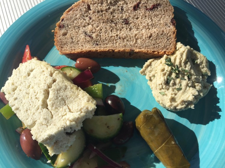 Once the vegan feta was in the oven, I began working on the other parts of the meal. The feta was to go on top of a traditional Greek salad like I had many times on the Greek Isle of Lesbos. One of my favorite memories was eating a Greek salad on Melinda Beach (in June 2011 before going vegan) overlooking the beautifully blue Aegean Sea.
