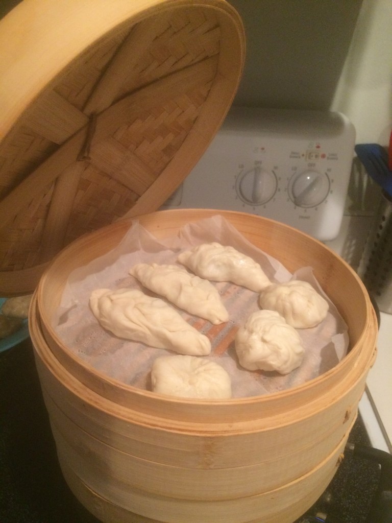 Rather poorly shaped vegan Tibetan momos in a bamboo steamer