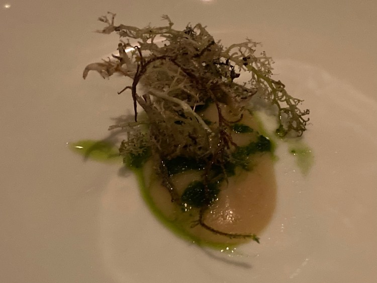 The second course also consisted of two parts: wild garlic and rocket focaccia aigo boulido (boiled garlic). I found the focaccia, which was served on a bed of polished stones, soaked with flavor. The softness of this dish balanced nicely with the crispiness of the reindeer moss, which my waiter David informed me came from the English countryside. I overheard him reassure patrons at neighboring tables that it was indeed edible, perhaps anticipating some concern. These two dishes complimented each other nicely.
