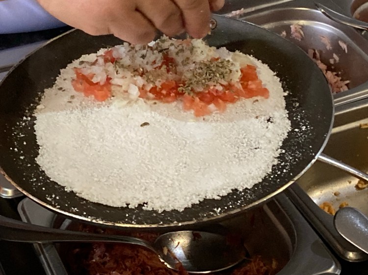 We awoke early the next day to get breakfast in our hotel before meeting our driver. There were a lot of non-vegan items, but we managed to find some fresh bananas, papaya and pineapple, some bread and margarine. A sign that read “Tapioca Show” above a cooking station intrigued me and I’m glad I went over for a closer look. The chef was happy to make me a breakfast tapioca without butter. Wanting a savory start to the day, I requested tomatoes and onions. It was amazing to watch her make this dish beginning with nothing more than a bowl of tiny balls of tapioca flour. She simply poured some in the pan, flattened them out to form a circle and let them cook together. When the time was right, she added the desired ingredients, waited a moment, folding the tapioca like an omlette and slipped onto my plate. My first tapioca experience was fantastic!