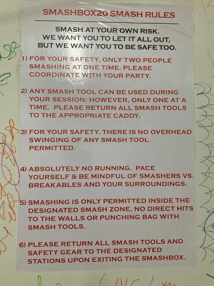 You can book a 10 minute or a 20 minute session at Smash Box 20 and an extra $7 will get you a video of your time in the smash room. You can also get fun addons, like a block of ice, or pay for extra time. You can smash alone, as a couple or in a group. Be sure to wear closed-toed shoes or boots and I recommend wearing something comfortable that you can easily move in. (And don’t forget to remove your phone from your pocket before suiting up.)