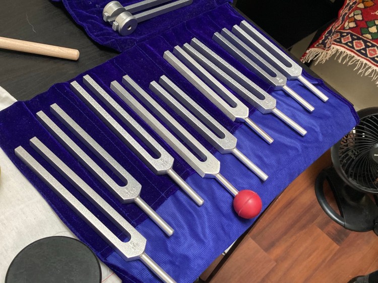 After a few more gentle taps of the singing bowl, I heard Adrienne tap a tuning fork on a pad that she had conveniently strapped onto her leg. She placed the vibrating tuning fork next to one of my ears.