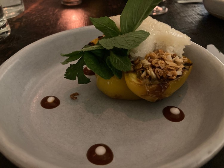 The fourth course was perhaps the most interesting dish of the evening and we could taste the amount of effort that went into it. We were brought a stuffed yellow bell pepper with sticky rice, orange pepper-coconut sauce, lime and Thai chilis. The waiter explained that the bell peppers are first pickled for a few days before being grilled and stuffed. The result of this process was a highly unique combination of flavors and more than I could have ever expected from a stuffed bell pepper.