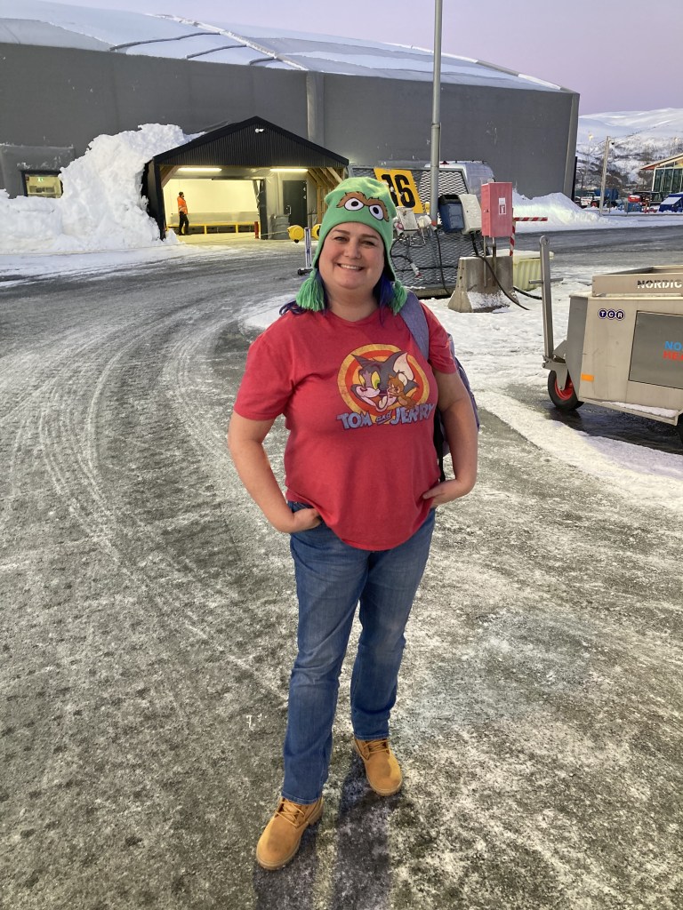 Retracing our steps, we switched planes in Tromsø. Unlike our last time transferring in this small airport, this time the air was much colder and the wind had picked up. A t-shirt was simply not enough, even with my menopause superpowers. But, I kept walking to the tiny terminal figuring that I would only be outside for a short time. To my surprise, we were to wait quite considerably outside this time to wait in line for immigration.