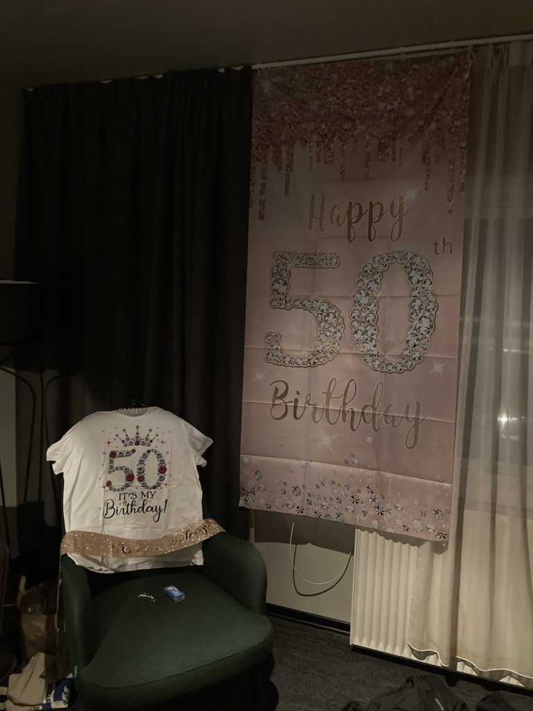 Chrissy surprised me by decorating the living room area of our suite with a birthday banner, a birthday t-shirt, a birthday tiara and a birthday sash for me to wear.