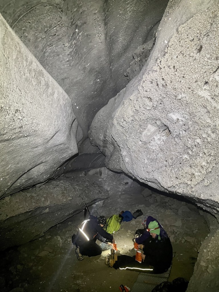 It was really neat to have lunch inside a cave. After our filling meal, we explored the cave a bit, climbing over and under chunks of ice. The icicles were amazing! The location was surreal and reminded me a bit of Superman’s Fortress of Solitude, but not as blue. The ice was often sparkling like diamonds. A really gorgeous location!