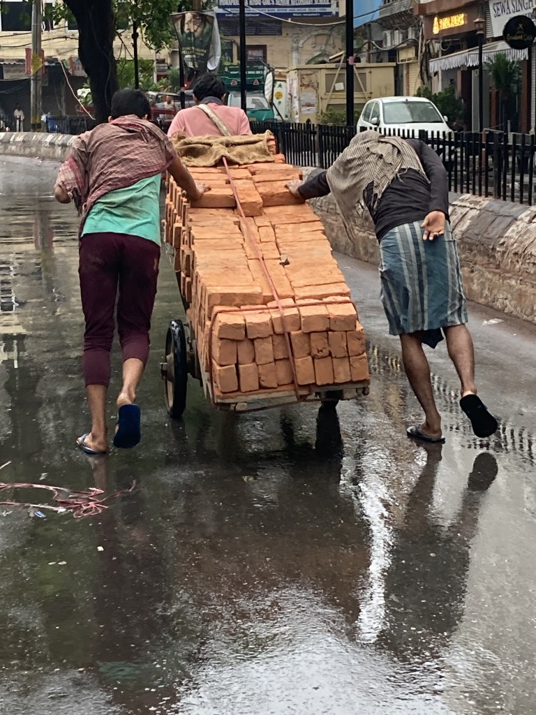 Another loud horn reverberates through my body, I step around a small pile of garbage and I pass a man perfuming his storefront with incense. Two men are fighting about where to park a motorbike and it’s hard to ignore the child standing in front of me with her hand out hoping for money. I look up and wave to the woman with her head out the third or fourth story window watching the crowd from above. I pass a man getting a shave with a straight razor right next to a swarm of shoppers, and motorbikes and people pulling carts and dogs and the occasional cow, cat or monkey. None of this seems to phase anyone. And then it starts to rain. “So this is India”, I think.