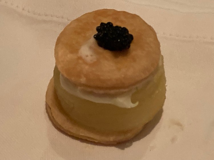 The second half of the first entree was a potato vol au vent canapé topped with kelp caviar. This dish consisted of mille-feuille pastry (which translates to 1000 layers) with potato beaujolais and potato cream. The kelp caviar was made from agar agar and charcoal. I found this adorable single bite rich and creamy and it quite literally melted in my mouth.