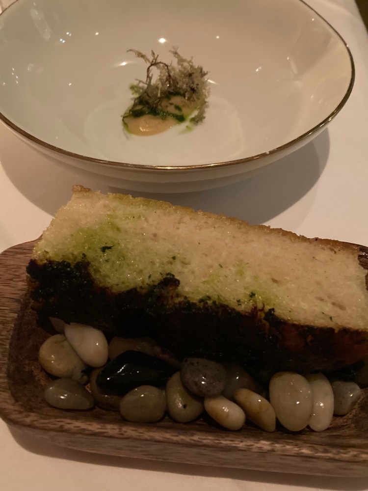 The second course also consisted of two parts: wild garlic and rocket focaccia aigo boulido (boiled garlic). I found the focaccia, which was served on a bed of polished stones, soaked with flavor. The softness of this dish balanced nicely with the crispiness of the reindeer moss, which my waiter David informed me came from the English countryside. I overheard him reassure patrons at neighboring tables that it was indeed edible, perhaps anticipating some concern. These two dishes complimented each other nicely.