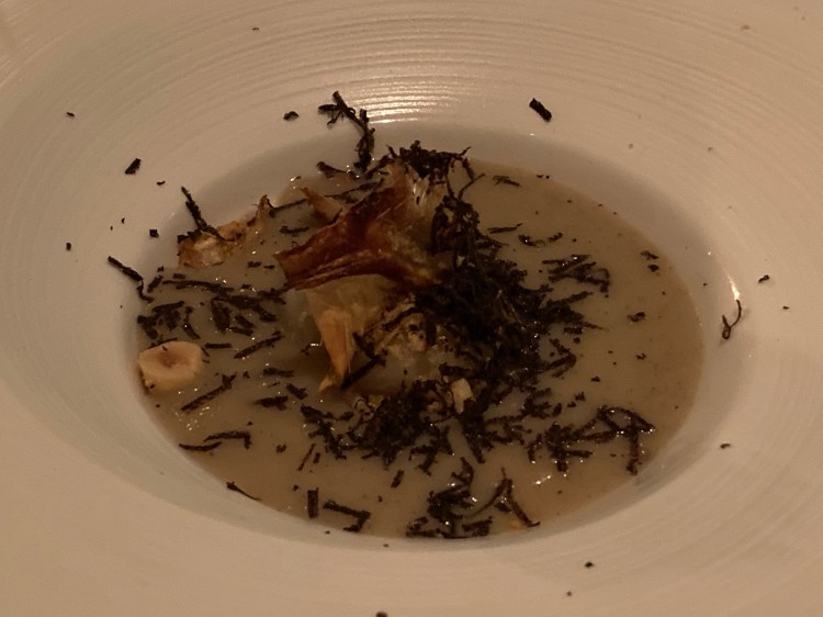 Before the third course was served, the waitstaff brought cutlery for the first time. The waiter brought the confit Jerusalem artichoke and artichoke crisps to the table before pouring the artichoke and black truffle velouté over the dish. He then proceeded to shave black truffle onto the plate. I was told that all parts of the artichoke was used, giving it the “fizzy” sensation. This dish was topped with slivered almonds.