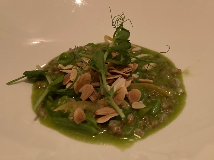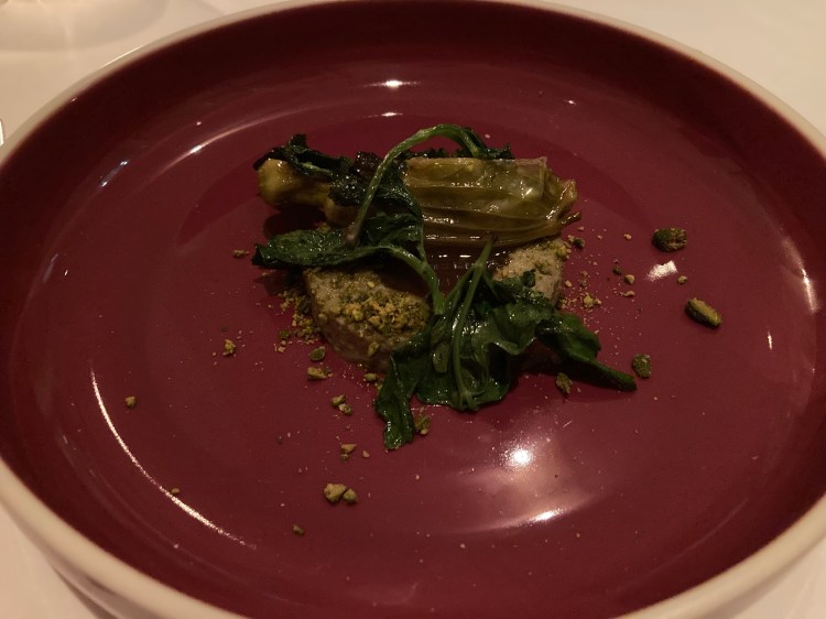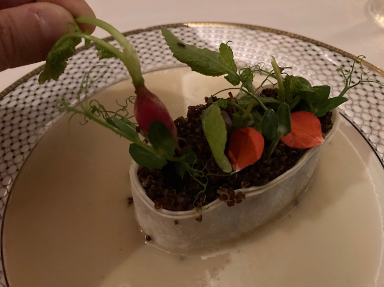 The eighth course was perhaps the most interesting-looking. This dish was a vegan version of petit pois a la Française. Gauthier’s take on this common French dish included vegan parmesan, pickled onion, charred cos lettuce and smoked granite, which was added at the table. What an interesting mix of flavors! I very much enjoying the chilled peas as well as the texture of the cos lettuce.