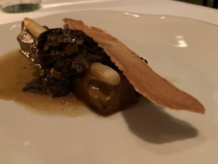 Course seven consisted of white asparagus and calcot onion and stewed morels (considered a foraging mushroom) and creamed sauce topped with a long palmito (heart of palm). The base of this dish was a gelled duxelles, the sauce included cream of mushroom with smoked tofu and it was topped with a branch of puff pastry. The waiter told me that the combination of white asparagus and morel mushrooms is quite common in French cuisine as they both are harvested at the same time of year – spring.