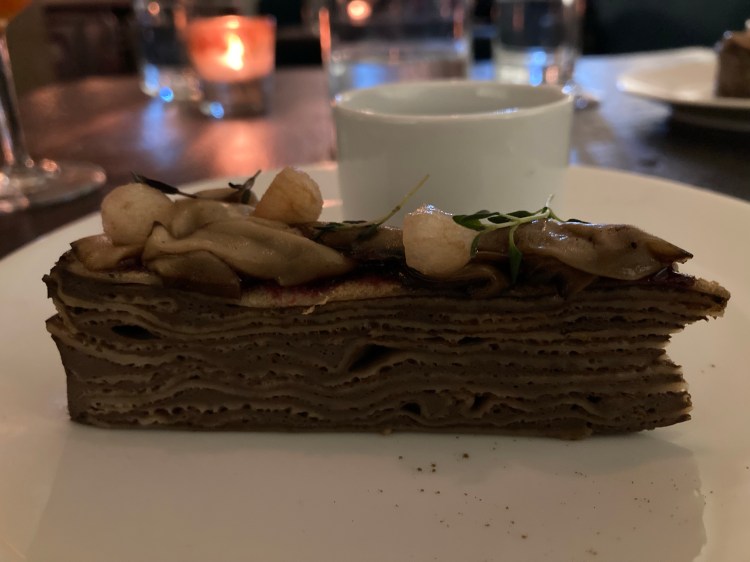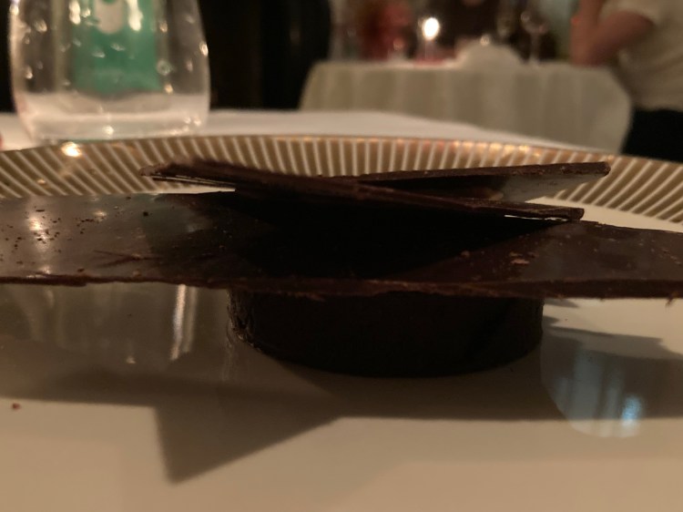 The final course was the most surprising of the evening. This dish was a dark chocolate tart with a chocolate genoise filled with black olives and kalamata olive oil. The dish included tonka beans and crystallized shards of vegan chocolate, which was made with oat milk.