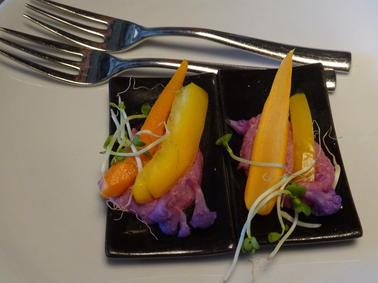 I opted for the 4-course meal (so without the soup course). The meal began with a very colorful hors-d’oeuvre reminding me that the art of fine-dining includes a very important visual component.