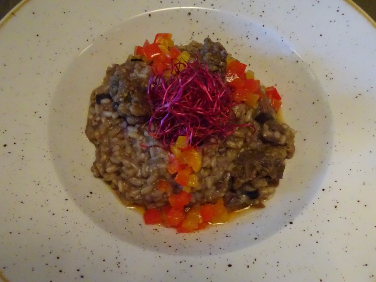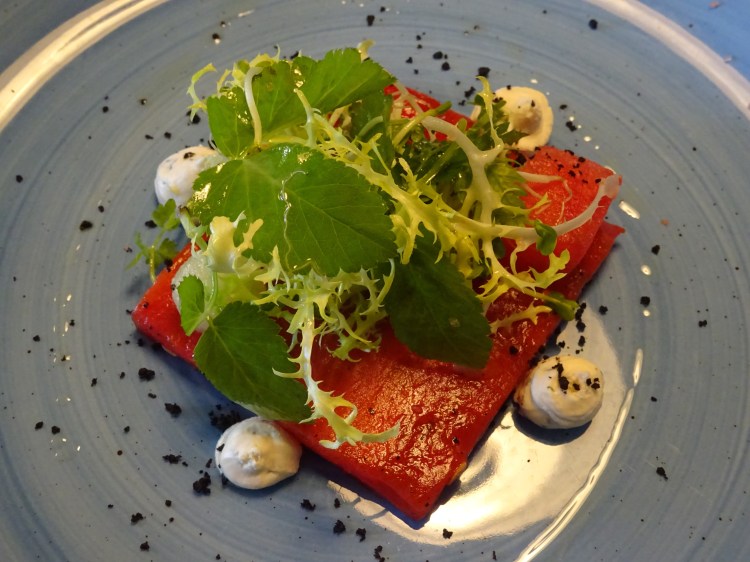 Our celebratory evening began with an appetizer of pickled beetroot with radish and beetroot jelly, drizzled with chive oil. I enjoyed the balanced mix of textures in this dish.