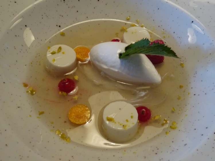 The pre-dessert course was a rhubarb float with pomegranate spritz and was designed to refresh the palette. The red spritz was added at the table. I loved this dish and found it very refreshing indeed! I first tasted sweet, then the slight sourness of the rhubarb – just what was needed at this point in the meal.