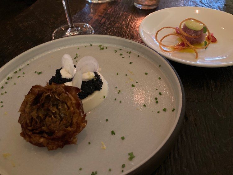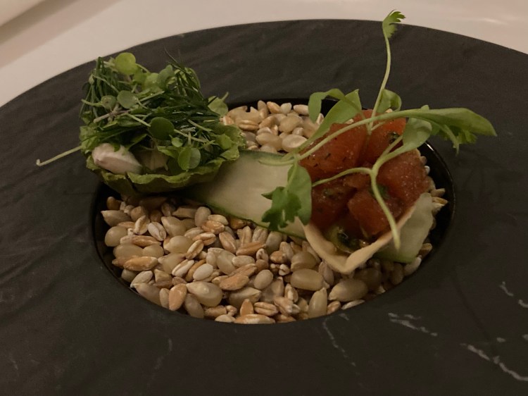 Elizabeth’s fine-dining experience began with an amuse-bouche: a seaweed tuna tartare & cutlet and watercress carrot top tartlet. The seaweed tuna tartare was made of wasabi and avocado mousseline, ginger-nama shoyu and micro-cilantro. The “tuna” consisted of konjac (a root vegetable found in east and southeast Asia), algae oil and algae stock. The waitress told me quite an interesting fact about this dish: flamingos actually get their pink coloring because they eat the shrimp who dine on the type of algae featured in this tartare. The shell that cupped all the ingredients was made of tapioca and rice.