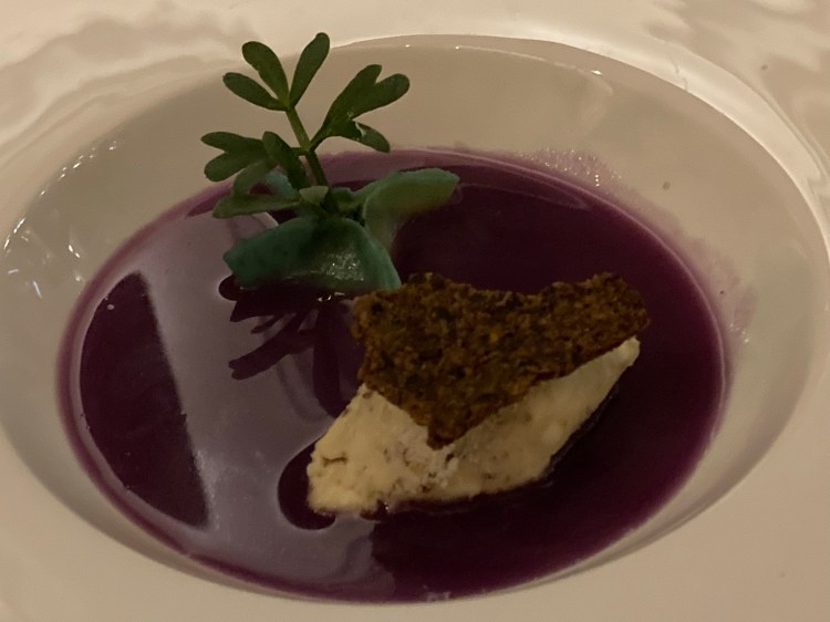 I very much enjoy chilled soups in general, so I was excited to try Elizabeth’s second course: chilled purple cabbage soup, consisting of a kohlrabi dumpling, dijon parmesan quenelle, and einkorn crisp. The outside of the dumpling is made by cold-pressing kohlrabi that was marinated in pine needle oil. The filling includes anise, yellow chartreuse and baby spinach that was marinated in tarragon oil and anise seed. The waitress poured the beautiful purple cabbage broth at the table, creating quite a colorful, not to mention flavorful, second course.