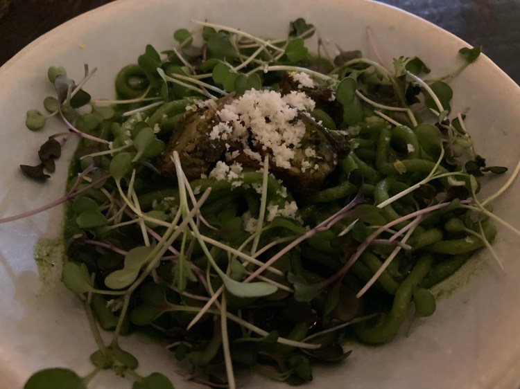 Between the two of us, we were able to sample quite a few menu items. For appetizers, I settled on the baked feta with watermelon and fresh rosemary. Chrissy ordered the “shitake escargots” in white wine with warm lime-garlic-NOOCH* ‘Butter’. For those who might not know, Nooch is a slang term (that is known by vegans everywhere) for nutritional yeast, which has a nutty cheezy flavor and it’s a great source of B12.