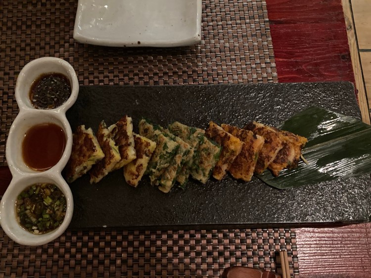 Our Hangawi culinary experience vegan with the Korean pancakes platter. This included kimchi mushroom, leek and kabocha pumpkin with mung beans. Three sauces accompanied this dish: sesame, pineapple and onion. All three pancake types were fantastic and I very much enjoyed trying out the various sauces in combination with the flavors of each pancake.