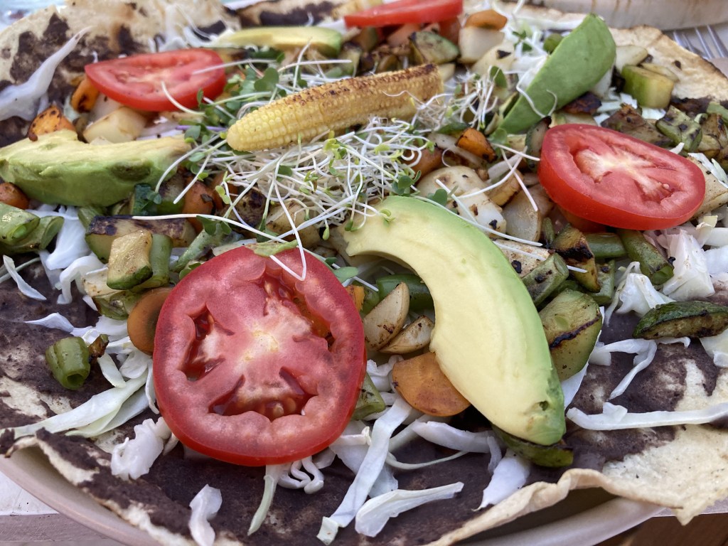 I ordered a tamal vegano (stuffed with mushrooms, pumpkin flowers and dry chili) as an appetizer and the tlayuda vegana as the main. This very filling dish is local Oaxacan and consists of a large crispy corn tortilla layered with refried black beans, sautéed vegetables and topped with fresh tomato slices and avocado. Both of these dishes were fabulous!