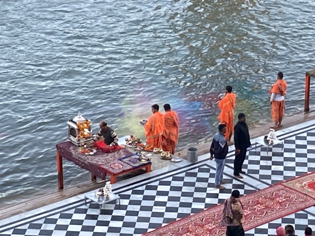 One of the most beautiful parts of the ceremony, in my opinion, was the singing that followed. A subsequent online search revealed that the priests and participants alike were singing the Ganga Lahari, a poem in Sanskrit written by a scholar and poet born in 1590 named Pundit Jagannath. The poem is a mixture of telling the origin story of the Ganges River (through the goddess’ hair) and sheer adoration of these holy waters. Here is one of my favorite sections of the poem. I think it speaks to why Hindus treasure the Ganges River so deeply: