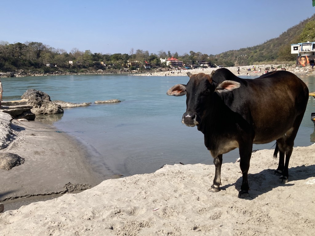 Eventually, it was time to head back. We hired a taxi and returned to Haridwar, and starting from the opposite side of the Ganges from whence we arrived was an entirely different experience. The way home began with a beautiful drive through a wooded mountainous road and our taxi driver had clearly taken that route many times as he whipped around bend after bend. It was a fun ride. When we got back to Haridwar, we were greeted by a gorgeous bull standing in front of our guesthouse. What a day!
