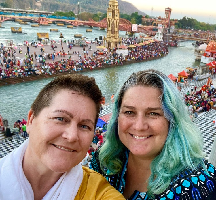 On our very first night in Haridwar, Chrissy and I observed the nightly Ganga Aarti at Har Ki Pauri, the largest of several sacred ghats (bathing steps). Let me begin by explaining that the Ganges River is not just a river in India; it’s the Divine Mother that gives life, and has the power to remove sins, cure illness and can liberate souls. Millions of people have been living on the banks of the river for thousands of years making it a whole culture unto itself. From what I could ascertain online, the Ganga Aarti (occurring twice daily at sunrise and sunset) is a devotional ritual that uses fire as an offering, a ceremony celebrating the River Goddess, Ganga.