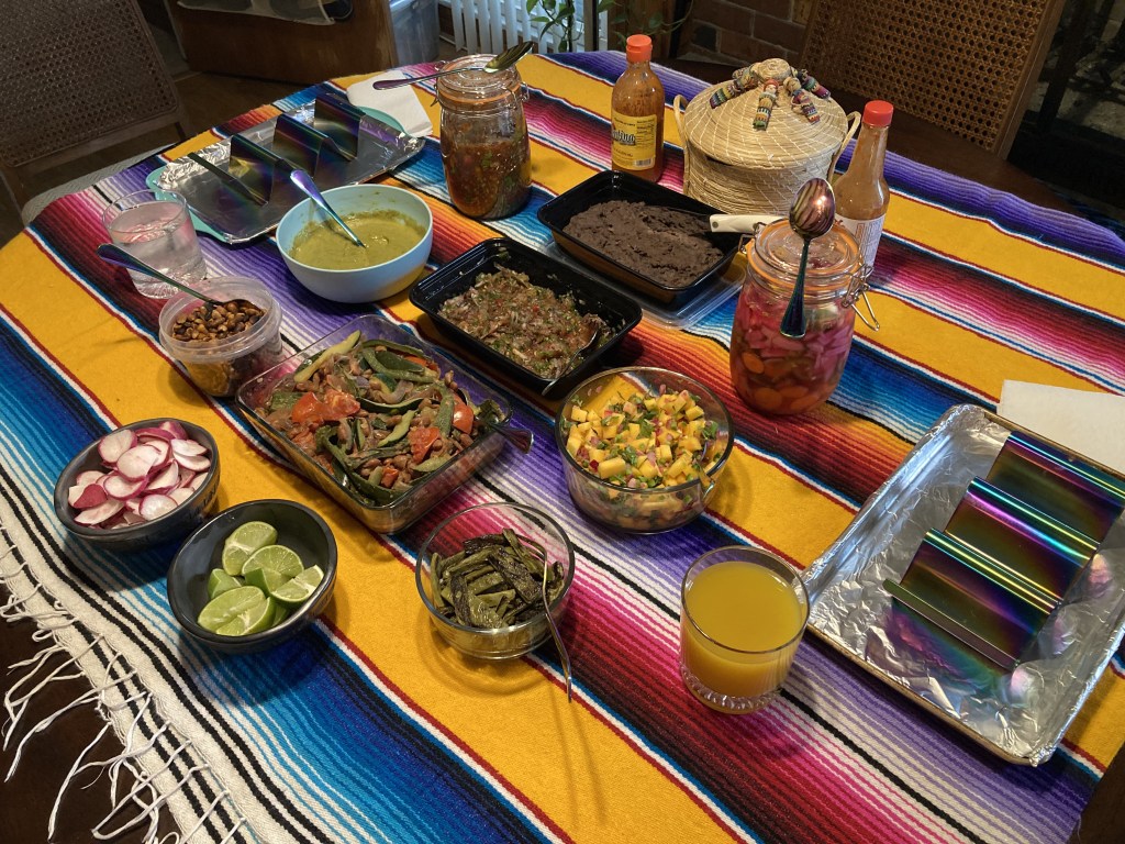 Using one of my colorful Mexican blankets as a table cloth, Chrissy set the table with all the fillings, topping and salsas, as well as the tortillas, drinks and my new taco holders.