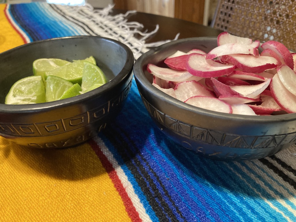 While the tortillas cooked, I thinly sliced some radishes to add as a topping and cut limes into wedges to squeeze over the assembled tacos to enhance their flavor. I was excited to use my new Oaxacan bowls made of barro negro (black clay) that I had recently brought back from my visit to Oaxaca only a few months before.