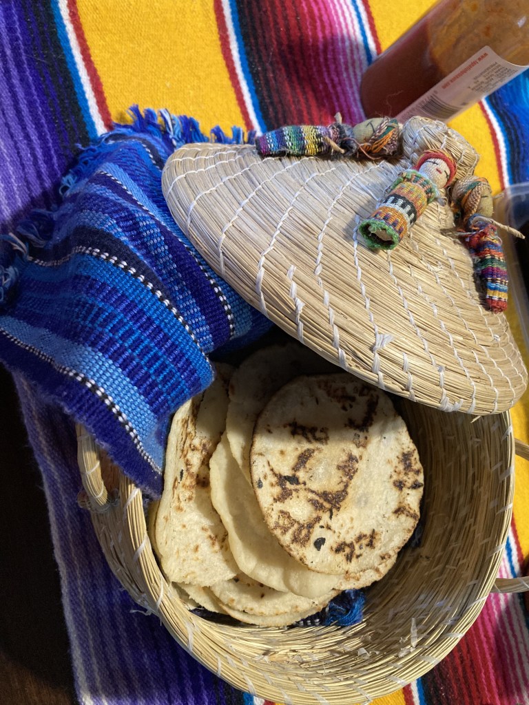Just before eating and while Chrissy was setting the table, I used my tortilla press, that I schlepped back from San Antonio ages ago, to finish making the fresh corn tortillas. It’s important to line the top and bottom of the press with plastic to prevent the dough from sticking to the press. As per my usual, I placed one ball of dough at a time in the center of the press, between two ziplock bags, and pressed down with medium force, not as tightly as possible to ensure I could peel the plastic off the tortilla before placing it gently onto a large skillet. Do not add oil. When I saw that the edges had lifted slightly off the pan, I flipped the tortilla over to cook a little while longer before transferring them into my tortilla warmer I had purchased in Guatemala. (Side note: in Guatemala, it is not common to use a tortilla press; instead they simply use their hands, making the tortillas generally thicker than those in Mexico.)