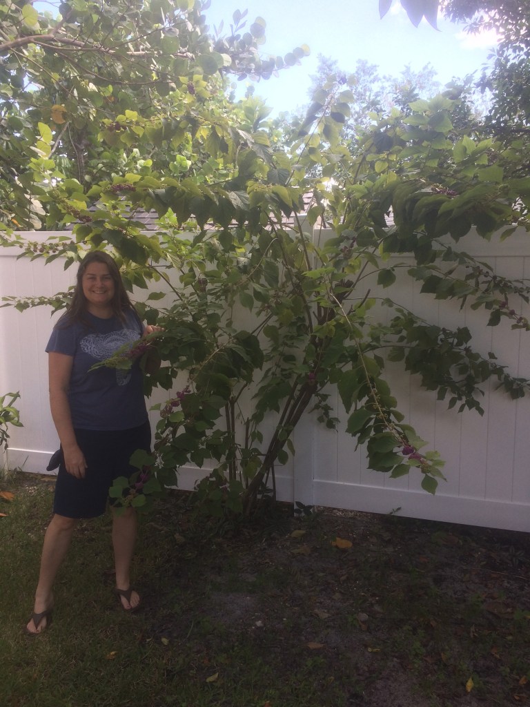 “That’s a native plant to Florida”, Chuck the arborist told me pointing to the scraggly bush in my new backyard I had almost pulled up a few days prior. He continued, “they will produce a bright purple berry”. After hearing “native” and “purple”, I was sold! So, I trimmed it back the way he had advised and waited for the unseemly bunch of sticks poking out of the ground to turn into a vibrant green bush with ripe purple berries. I learned that these are called beautyberries and it’s easy to see how they got their name. Turns out they are edible too!