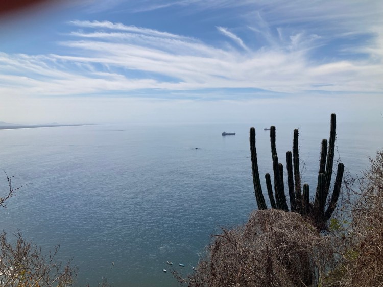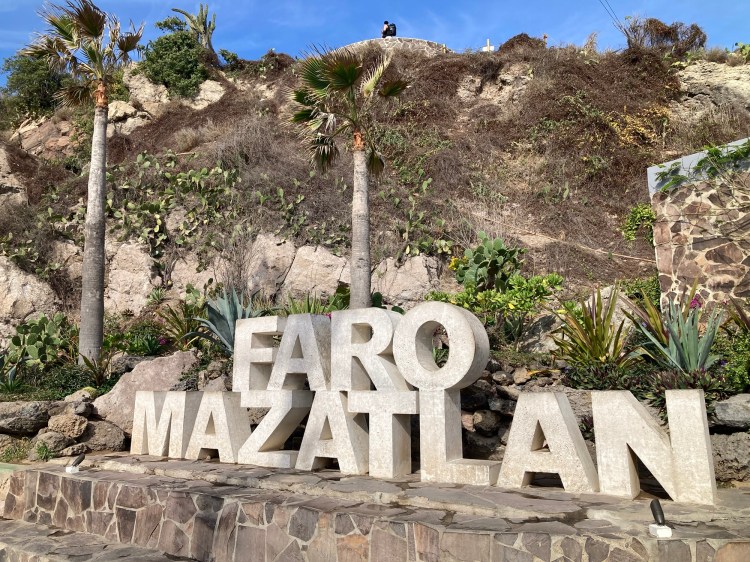 We took our mandatory pictures with the Faro Mazatlan sign at the base of the windy pathway to the top. The first half is a cement walkway with beautiful flowers and cacti on either side and it didn’t take long to start seeing beautiful views. Only after a few switchbacks did we see our first cat, sleeping peacefully under a bench. Another was enjoying the shade of a bush.
